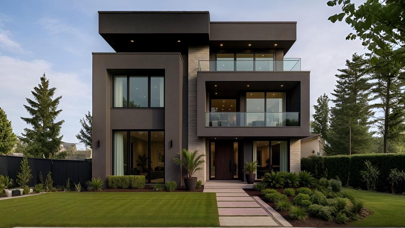 Desain fasad rumah modern mengutamakan inovasi bentuk dan material. Gaya ini sering memadukan elemen kaca besar, permainan bidang, serta pencahayaan eksterior yang menarik.